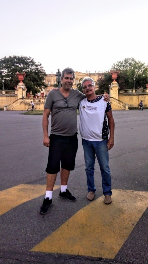 Foto 2 – Engº Marcelo Paiva e Maurício Mendes “In Memorian” (I.M.) – Maio 2018 – Foto tirada em frente ao Museu Nacional, na Quinta da Boa Vista – RJ. Circuito Cultural de São Cristóvão, criado pelo Maurício Mendes e pela equipe da Câmara Comunitária de São Cristóvão, com o apoio das Autoridades da região.