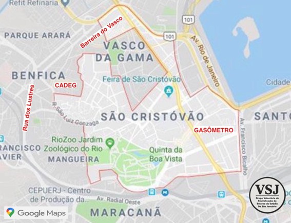 Imagem que mostra a proximidade e o trio de fluxo social e econômico entre o Bairro Vasco da Gama – CADEG – Rua dos Lustres. | Fonte da Imagem: Google Maps e GVRESJ / VSJ