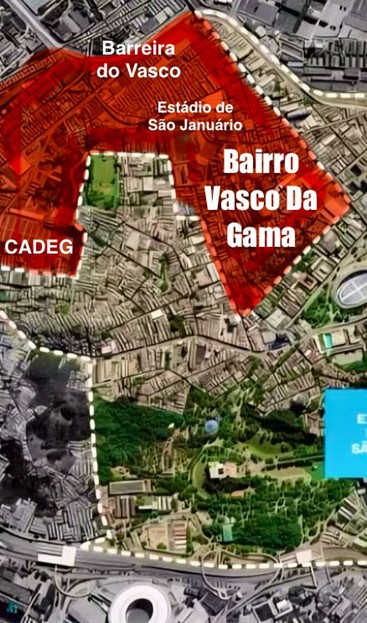 Área tracejada indica a Região a ser Requalificada (Revitalizada), na cor vermelha a região excluída (Bairro Vasco da Gama, o entorno do estádio de São Januário, a comunidade da Barreira do Vasco e a CADEG). | Fonte da Imagem: Prefeitura do Rio e GVRESJ / VSJ